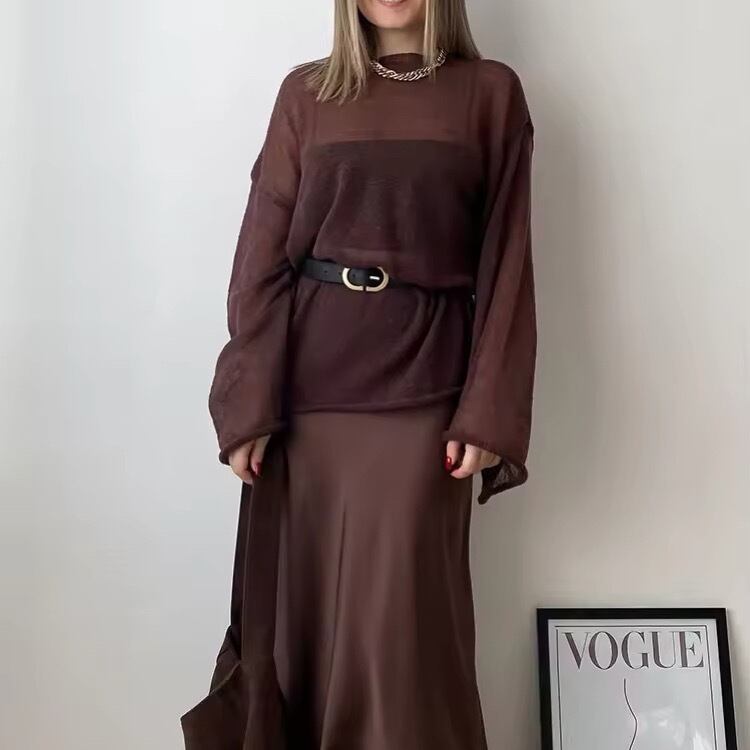 シアー素材の軽いセーター。 ノースリーブワンピースの上に重ねて上品な大人のおしゃれを楽しめます。 アクリル、モヘアのあたたかさがありますが、 薄手のため季節の変わり目にも活躍します。 トランペットの袖口、くるんとロールアップされた裾仕上げが、こなれ感を出しています。 綺麗な色が特徴。 トレンドのブラウン、ホワイト。 ニットなら手持ちアイテムに重ねるだけで、 簡単に、全身ブラウン、全身ホワイト完成。 顔うつりの良いピンクは見る人の気持ちを和らげ 着る人にも自信を与えてくれます。 神楽坂の桜テラス、カナルカフェのデートに着て行っちゃいましょう。 イタリア人みたいにイエベさんが得意な赤。 このデザインならさりげなく洗練されたカジュアルな雰囲気。 定番のダークグレー、アイボリーは、ブルベさんの得意。全方位で、いつも便利。 【サイズ】 バスト110cm/ 着丈66cm/ 袖丈50cm (Mサイズを中心として、バスト100cm前後までの方に着用可能。) 【色】 レッド ブラウン ダークグレー ベージュ ピンク ホワイト 【素材】 ポリエステル アクリル モヘア