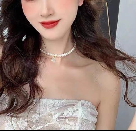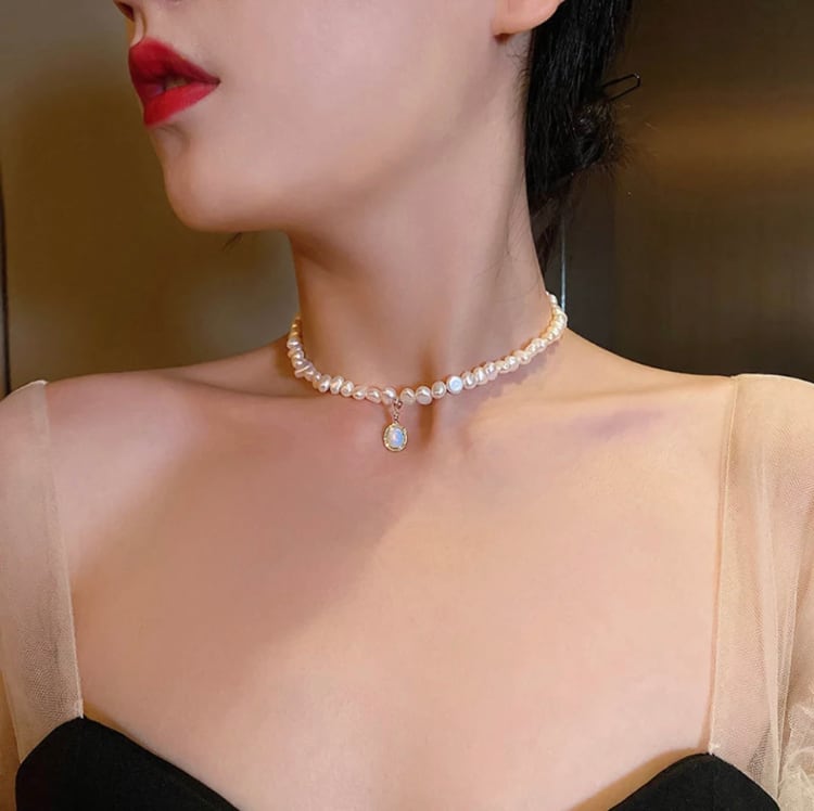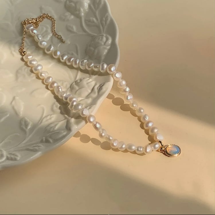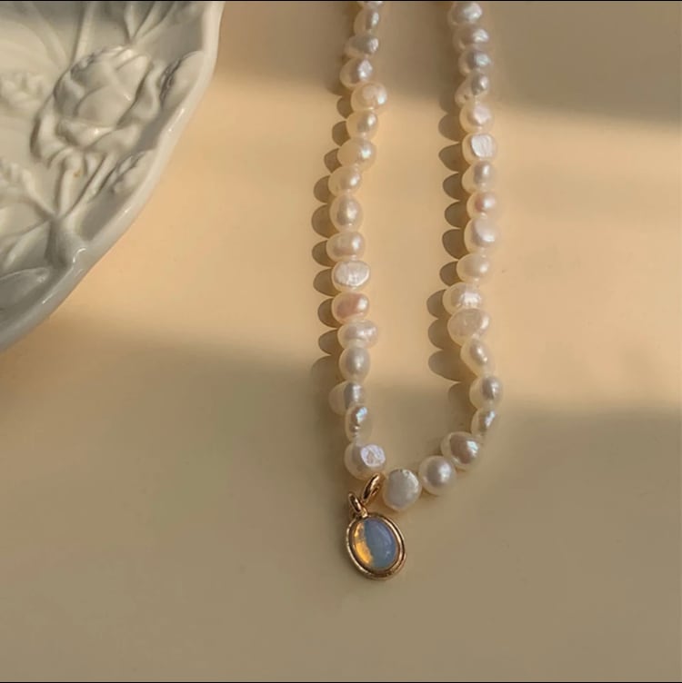 淡水パールネックレスに小さいムーンストーンのペンダントヘッドが可愛いネックレス。