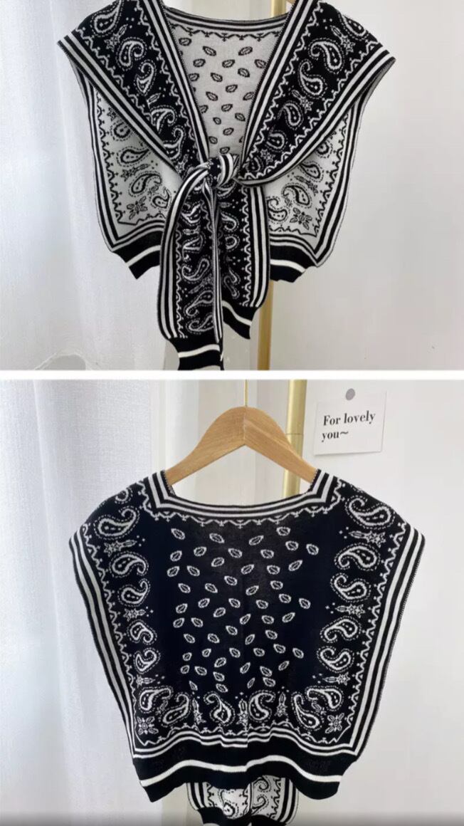 フェイクカラー兼冷房対策に欠かせないストールで遊び心満載のセーラーカラーとレトロなペイズリー。
