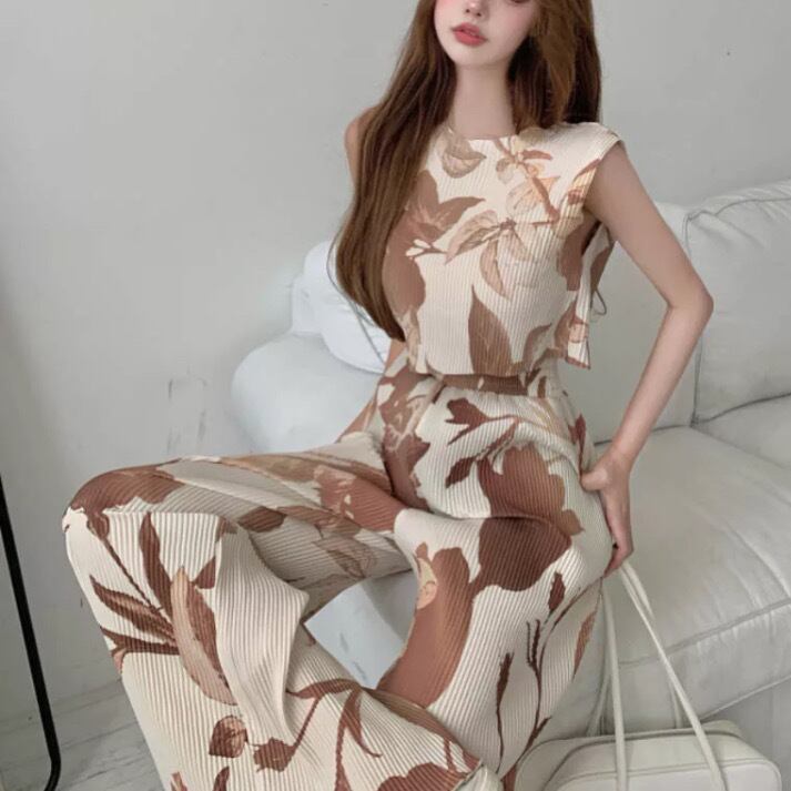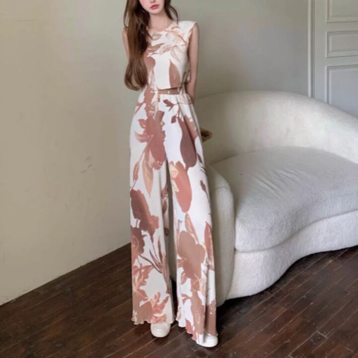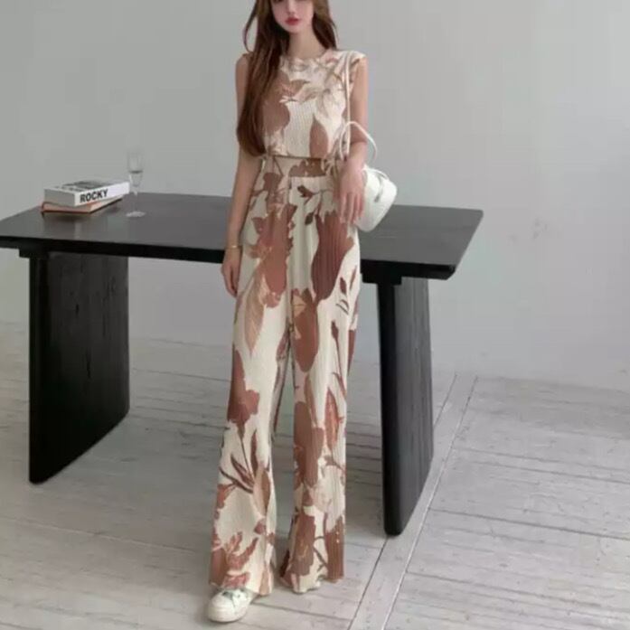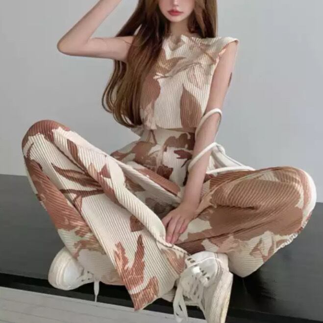 韓国スタイル2ピースノースリーブショートトップヴィンテージプリントカジュアルストレートパンツtwo251701