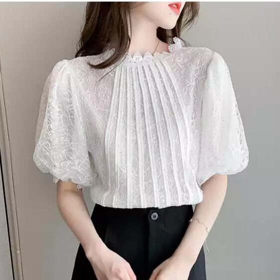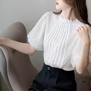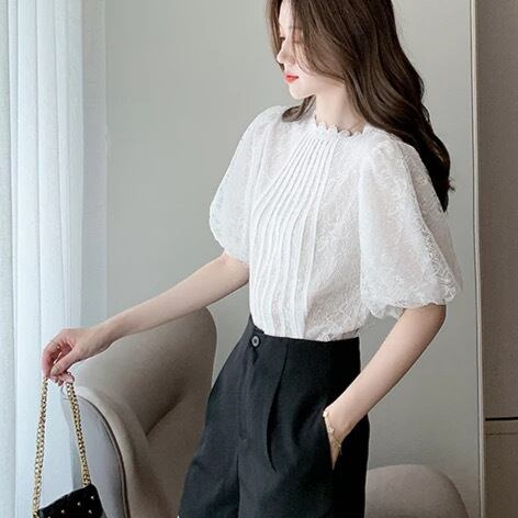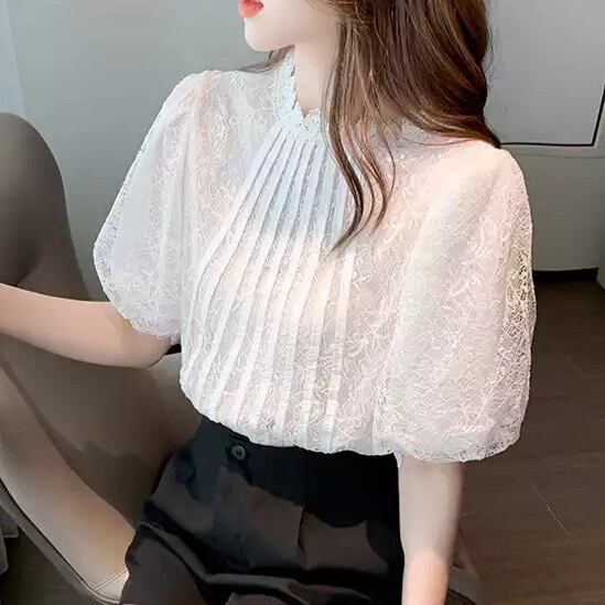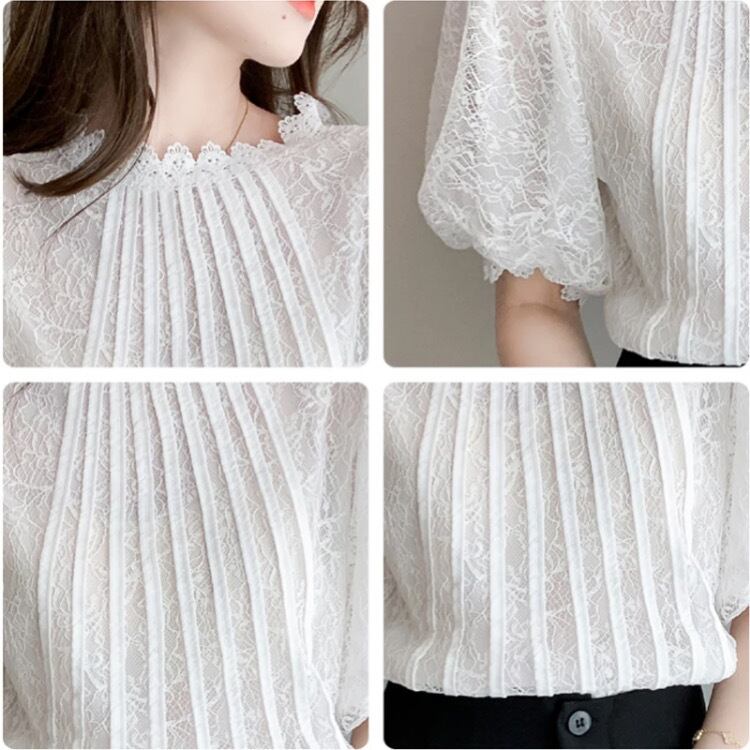 女性用半袖サマーブラウス,スタンドカラー,レース,ホワイト,f08,2021