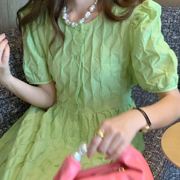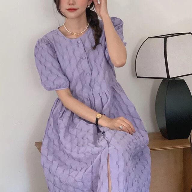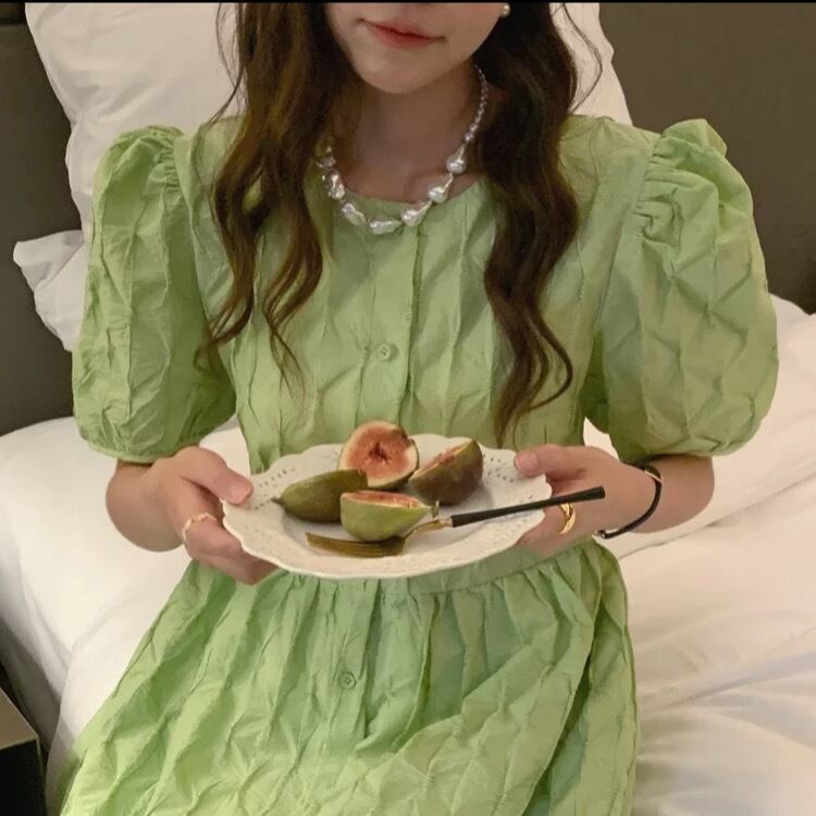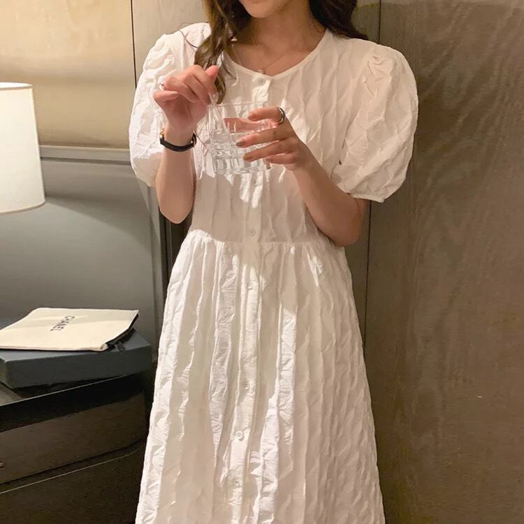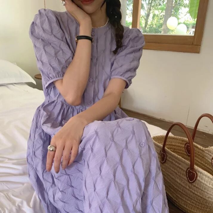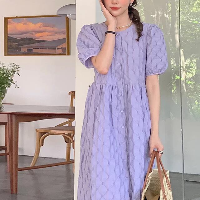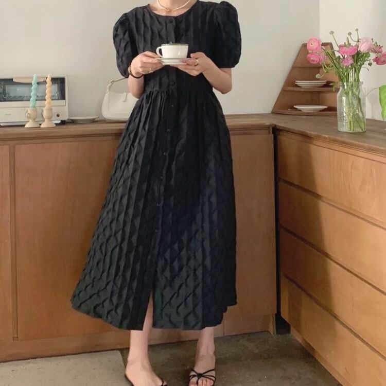 韓国パフスリーブOネック前ボタンダイヤモンドワッフルドレスop2615001
