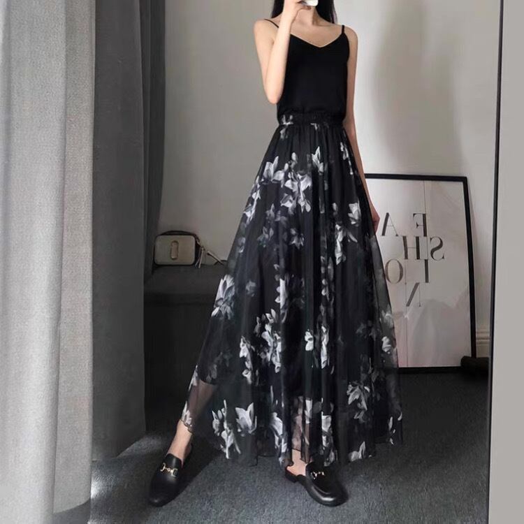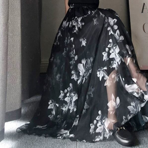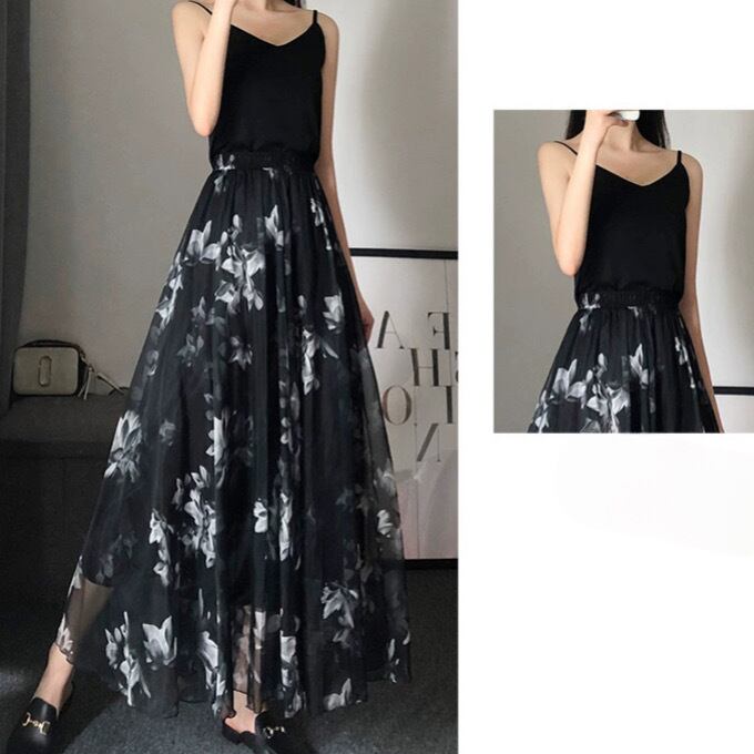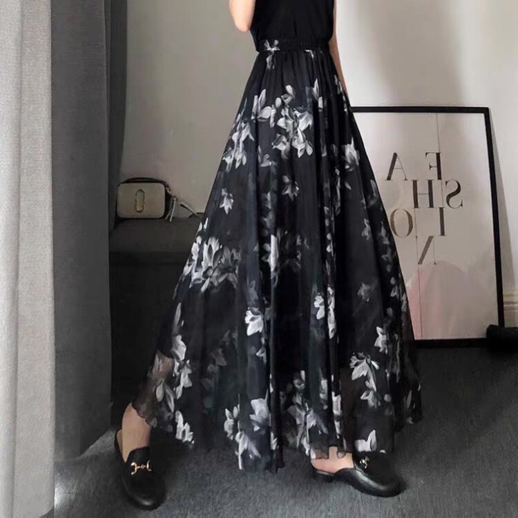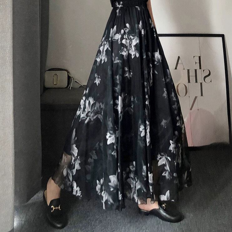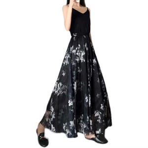 水墨画プリントサマースーパーロングシフォンアンブレラスカートブラックsklb261801