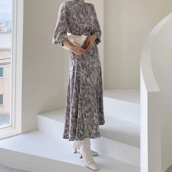 スタンドカラーの下にタックが取ってあるタイプはデコルテの薄いウェーブ体型にも、