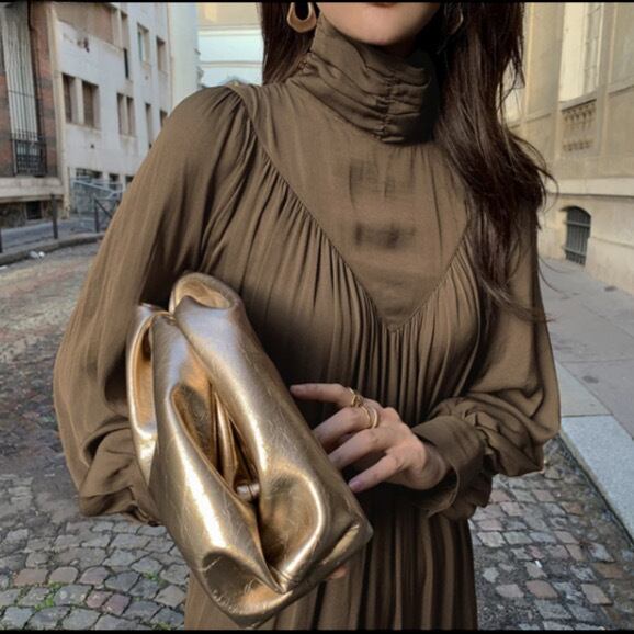 写真のような明るいゴールドのバッグ、アクセサリー、オレンジや白いストールなどで顔周りを明るくするのが上級者。