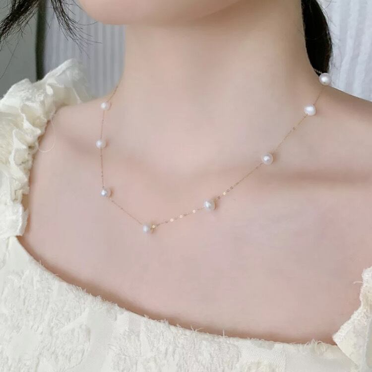 丸い淡水パールがゴールドのチェーンに間隔をあけて配置されたネックレスとブレスレット、ピアスセット。