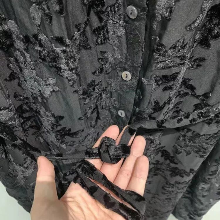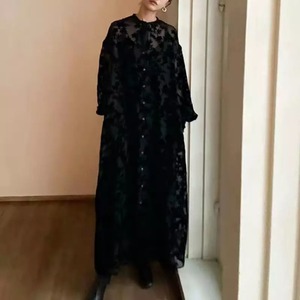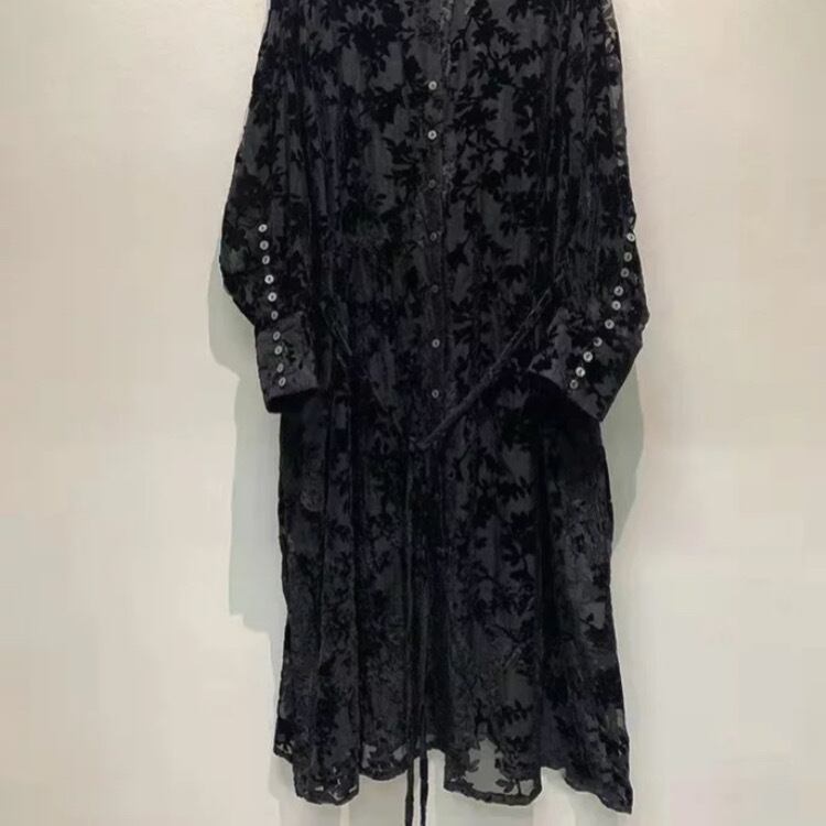 フロッキー加工で鼻が浮き彫りになっている柔らかいブラウスワンピースと、スパゲティストラップワンピースのツーピース。 袖口のボタンがポイントに。 ウェストリボンつき。