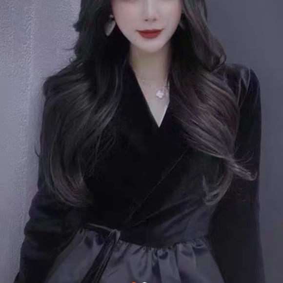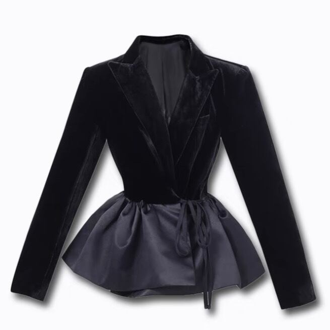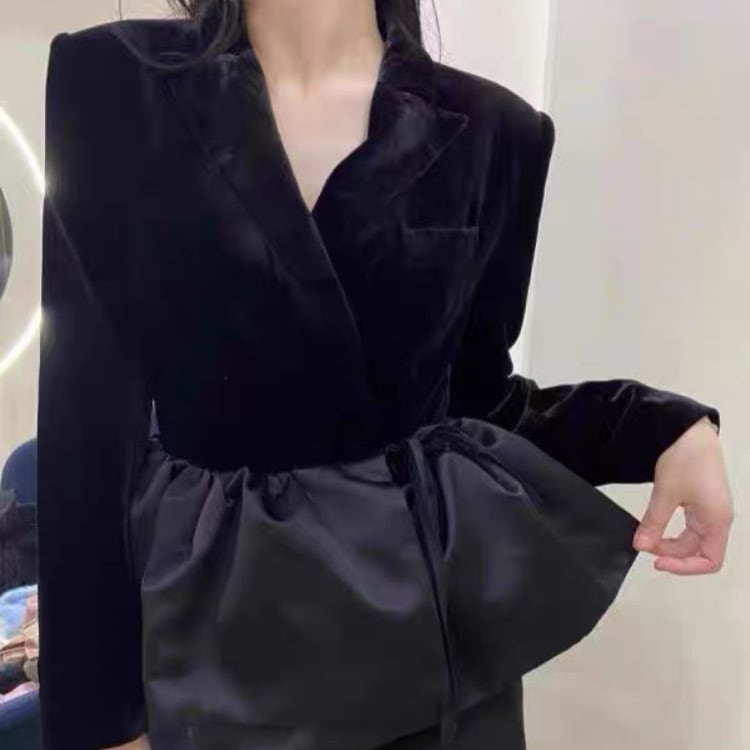 キリッと立ったテーラードと、裾の切り替えが可愛らしいベルベットジャケット。