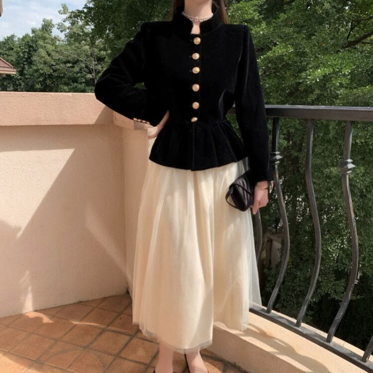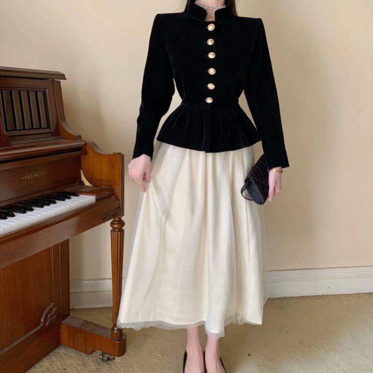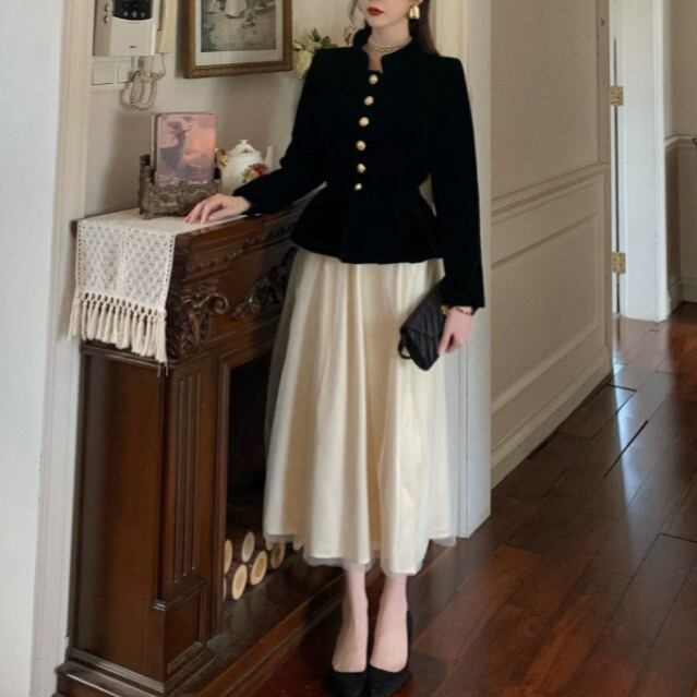 ジョルジュ・サンドの肖像画を思わせる黒いジャケットブラウスに、対象的なシフォンの柔らかいスカートのツーピース。