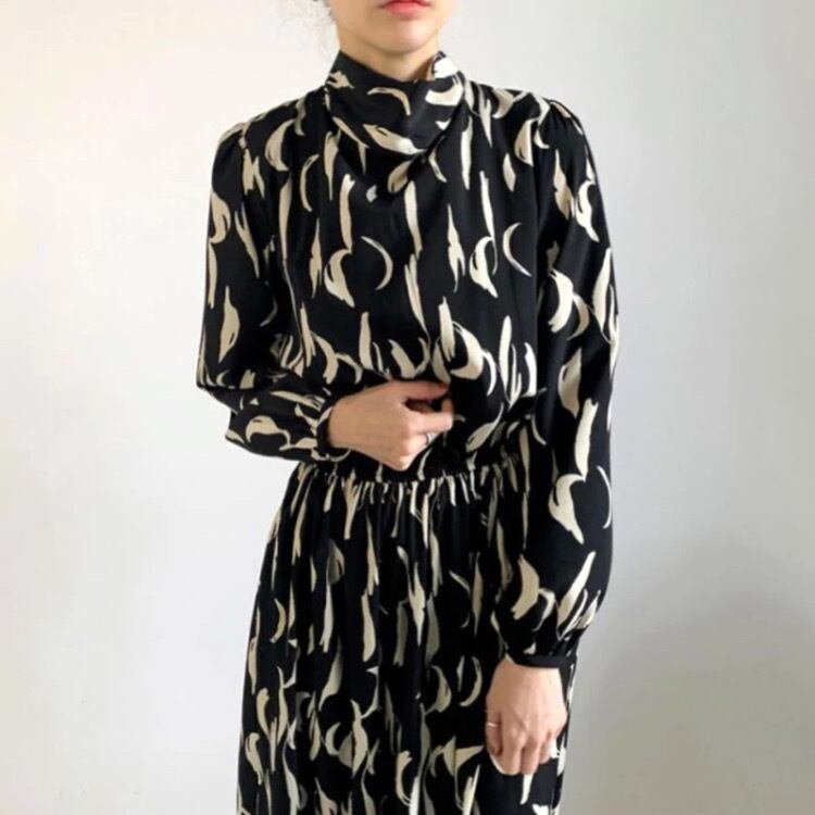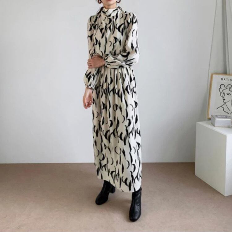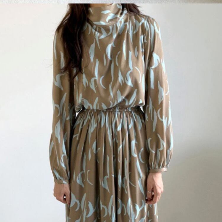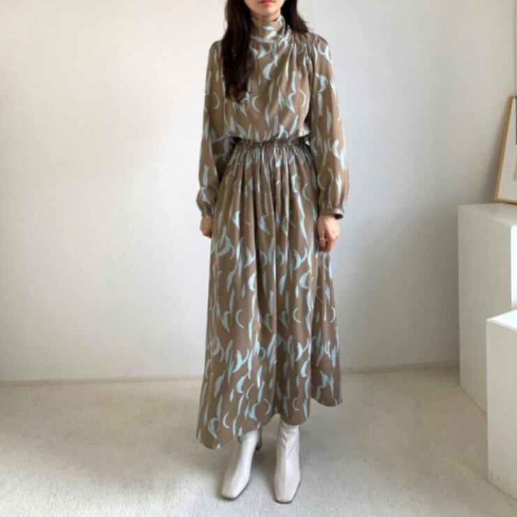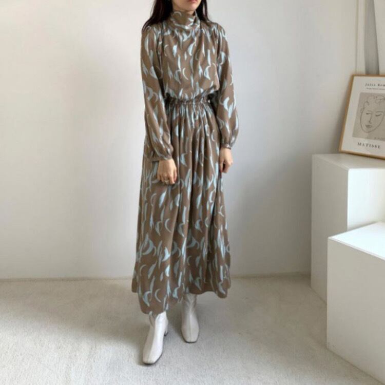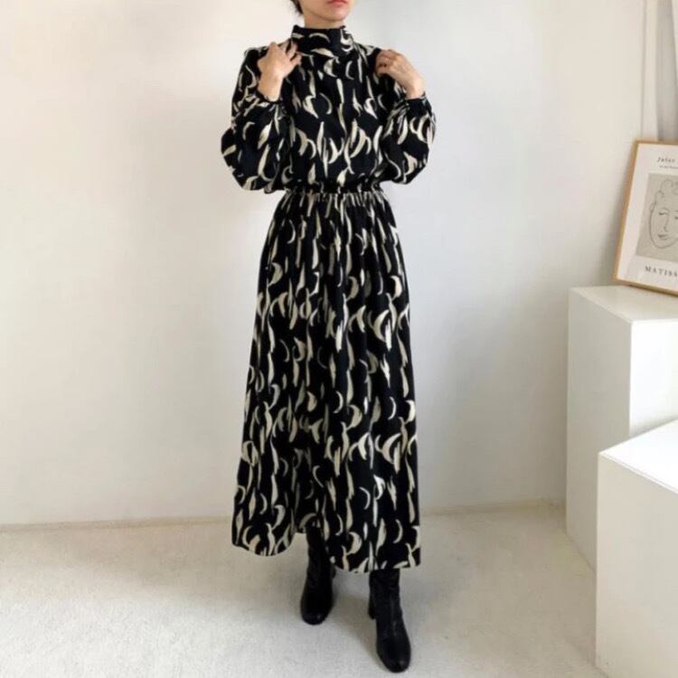 ハイネックのテロンとしたワンピースは着やすく首からデコルテが冷たい空気に触れないので、