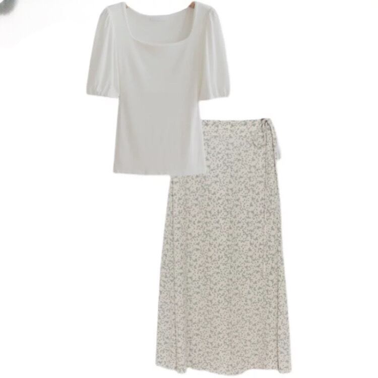 上品なセットアップで、おしゃれさも楽ちんさも手に入れましょう!このセットアップは、白いTシャツと揺れるラップスカートで構成されています。清潔感のある白いTシャツと、女性らしいフローラルスカートが相性抜群。セットアップだからこそ手軽におしゃれが楽しめ、忙しい朝でも悩まずにコーディネートを決められます。