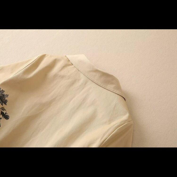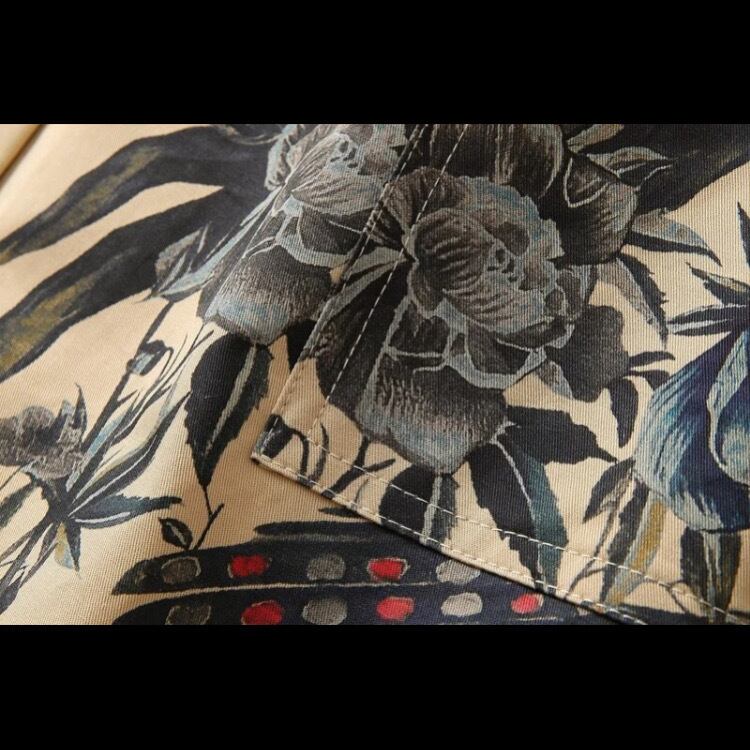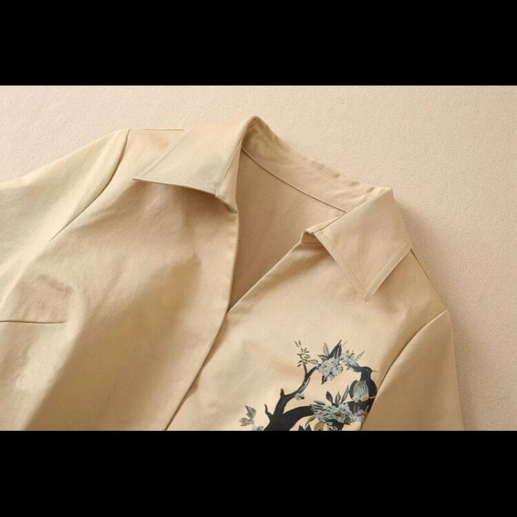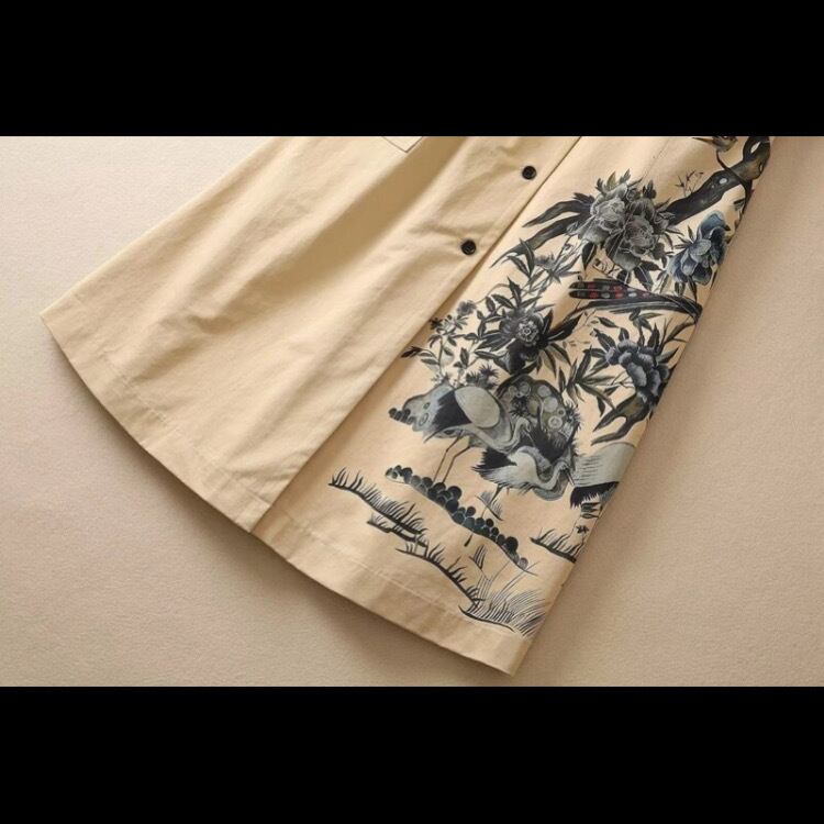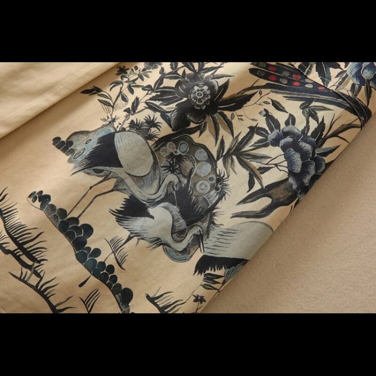 張りがあり柔らかな素材で、レトロなキャメルのような色合いがあたたかい雰囲気を出し、健康長寿やカップルに幸運を運ぶ鶴のモチーフがあしらわれた、ちょっとかっこいいワンピース。