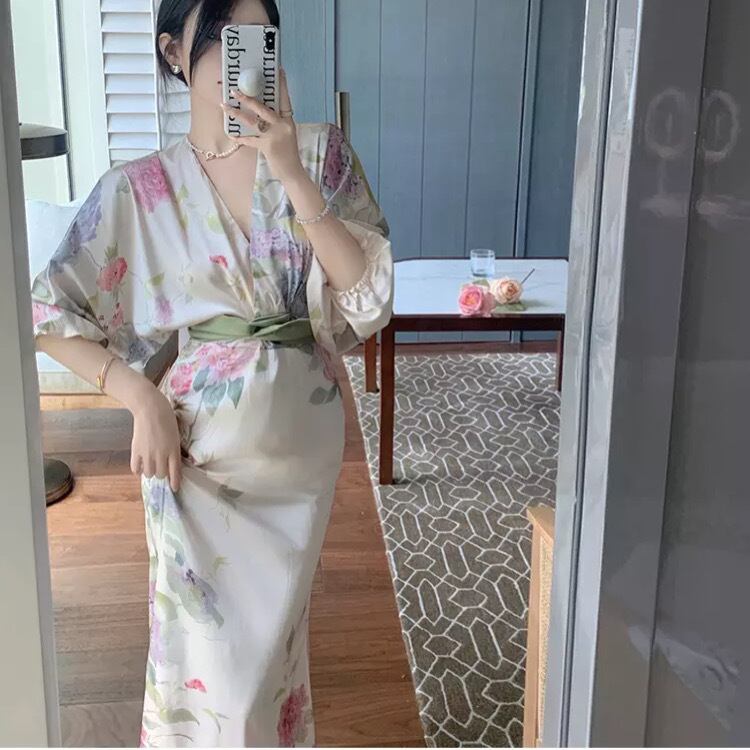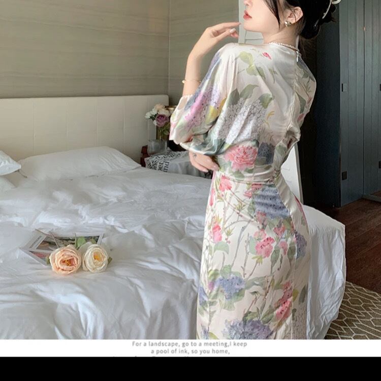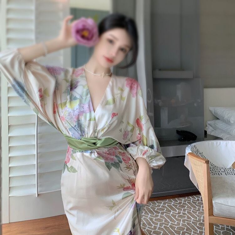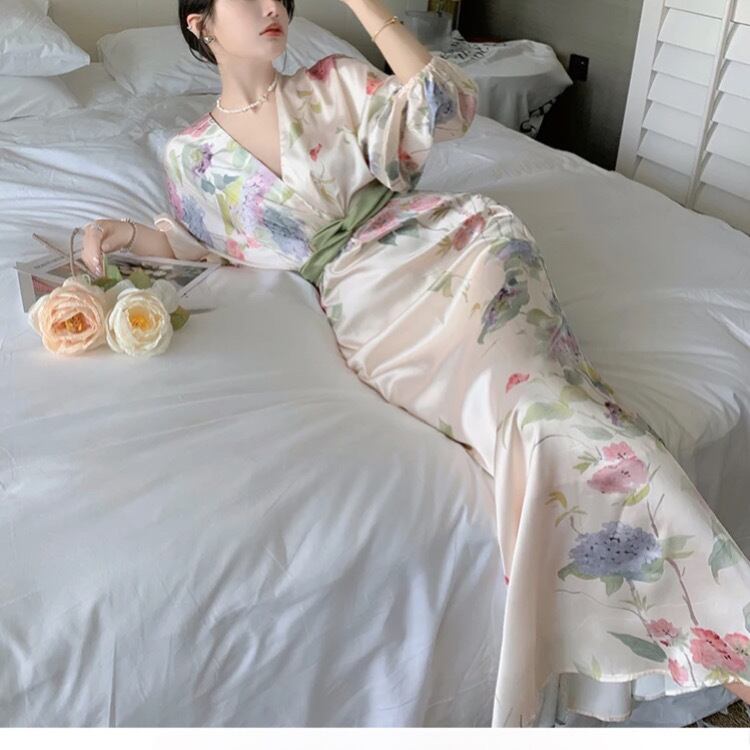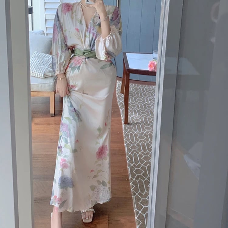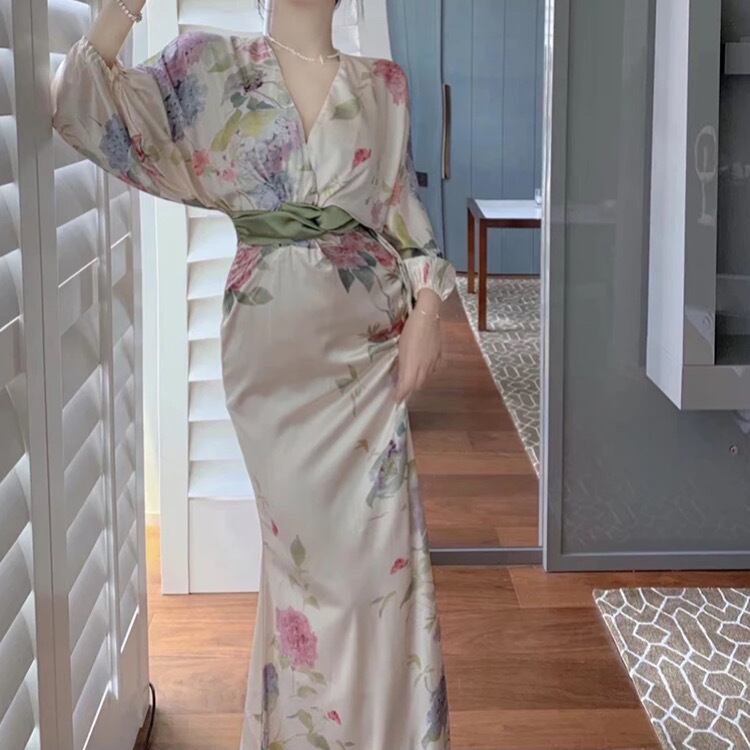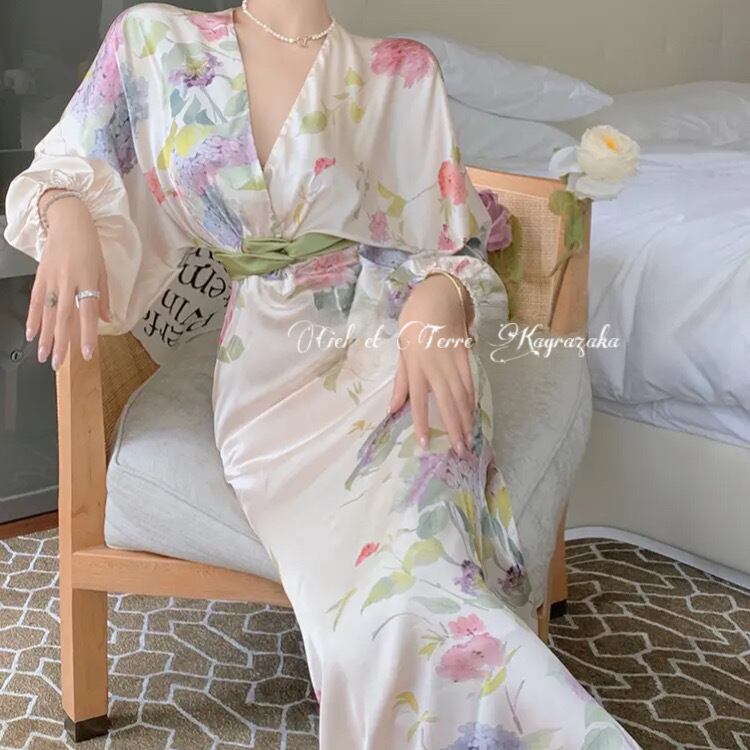 淡いカラーの雰囲気たっぷりサテンドレス。