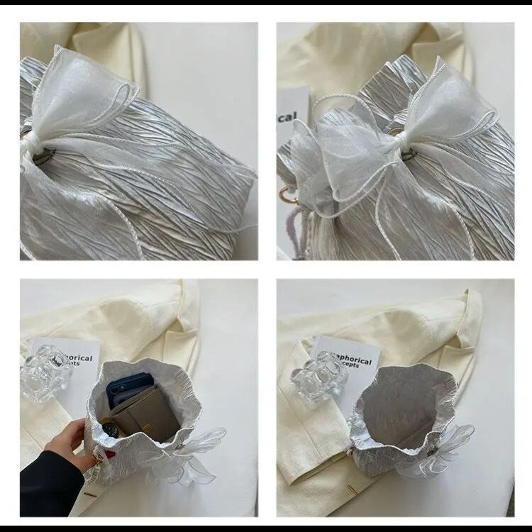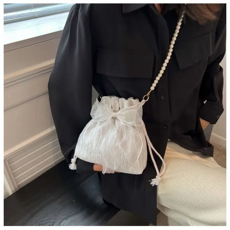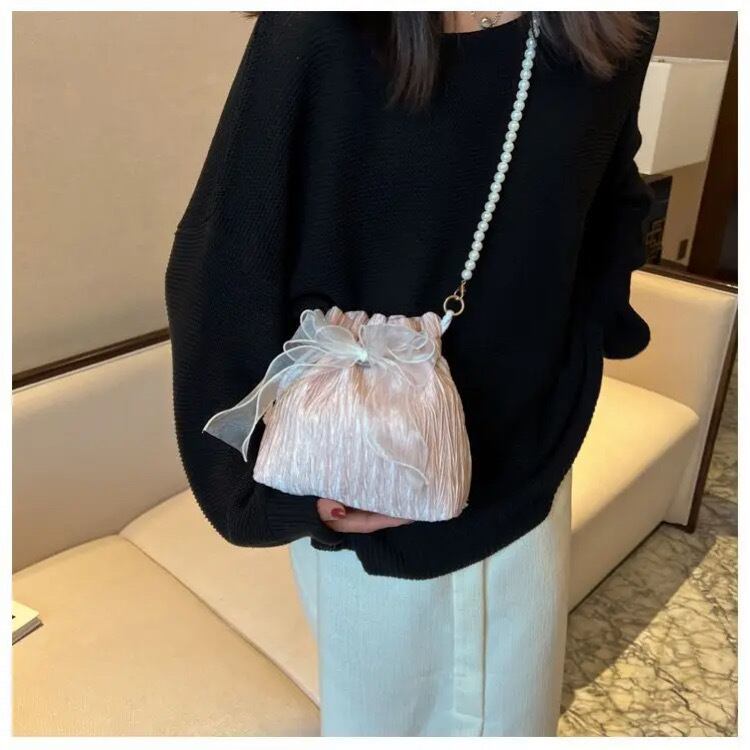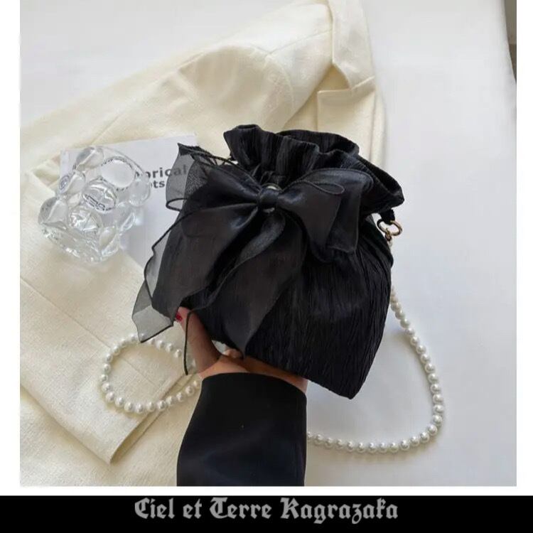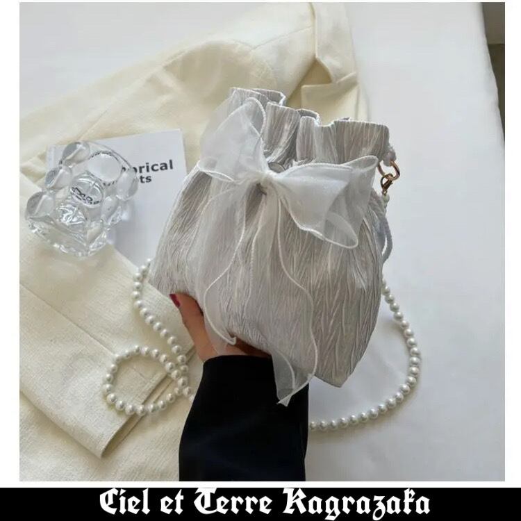 オーガンサ風のリボン、畝のある生地とパールのストラップがマッチした可愛いバッグ。