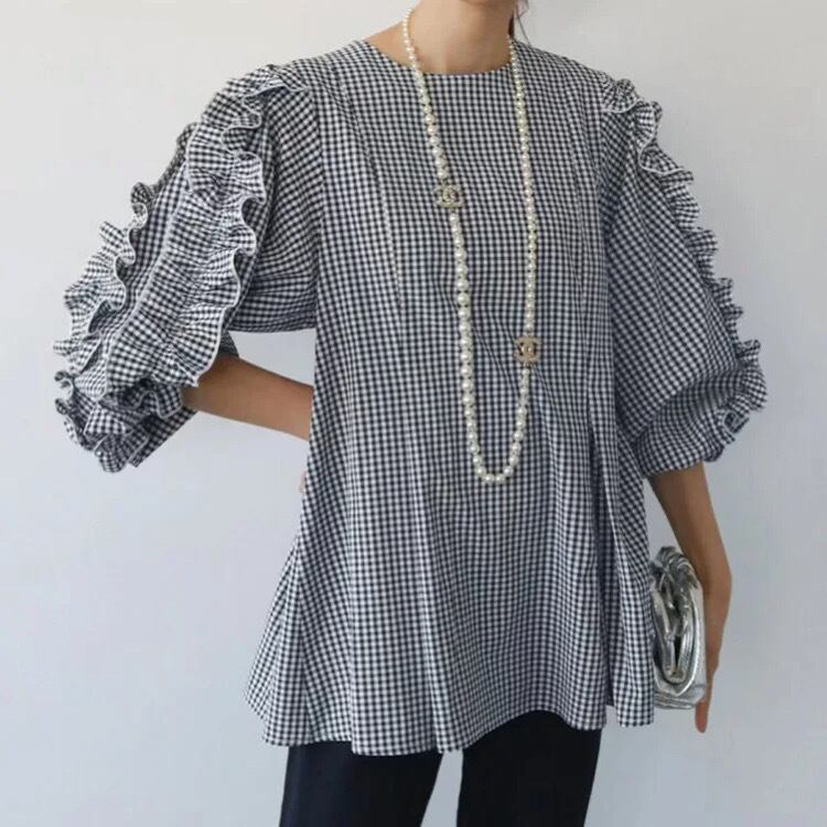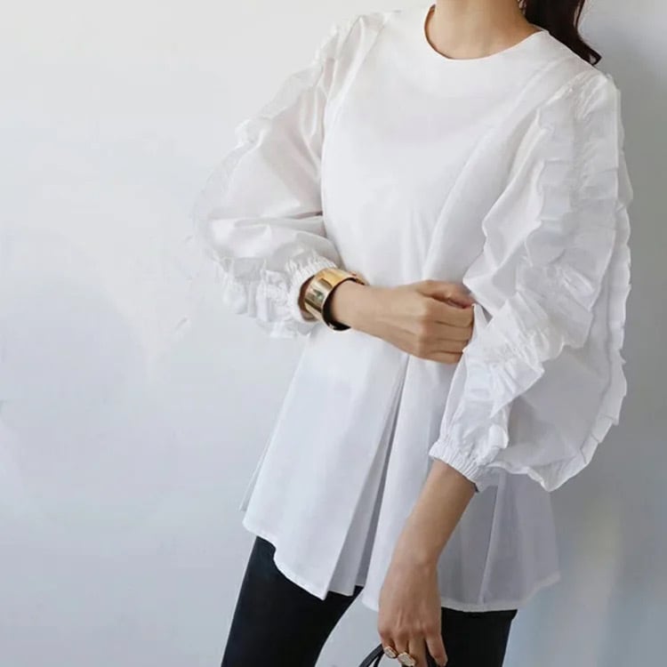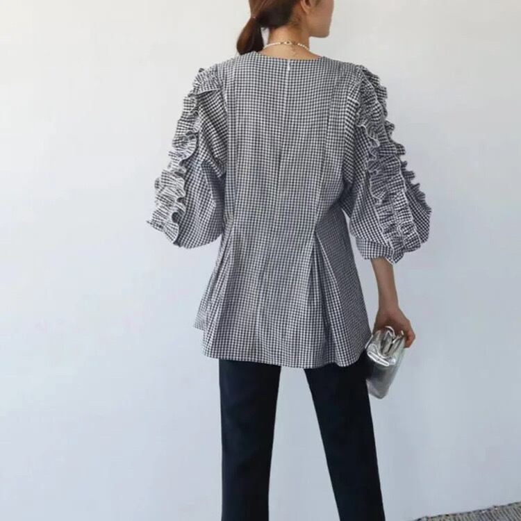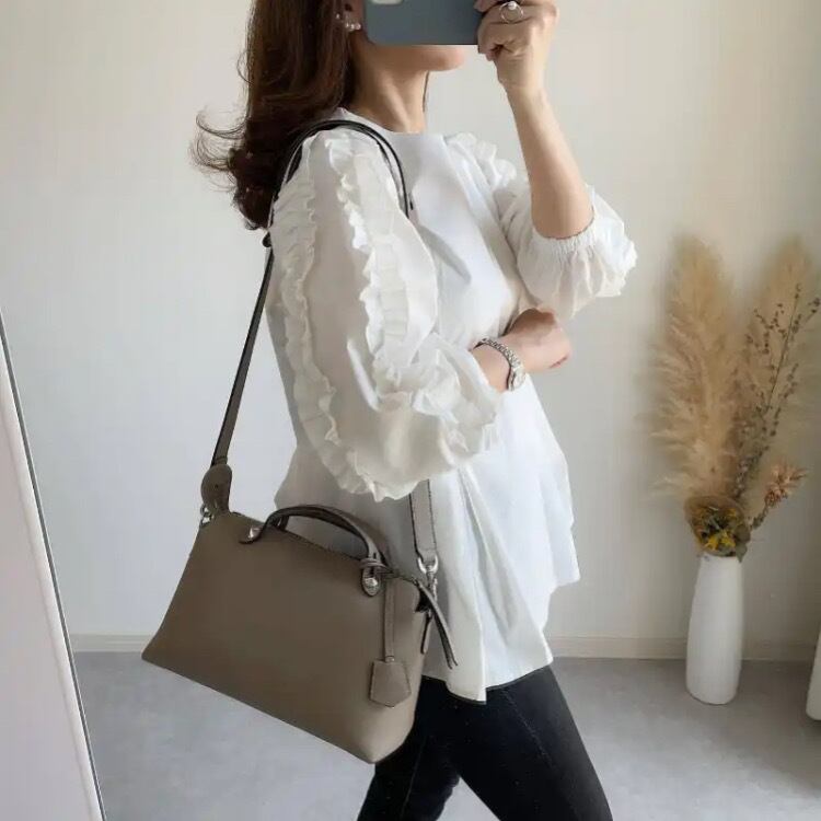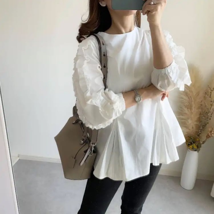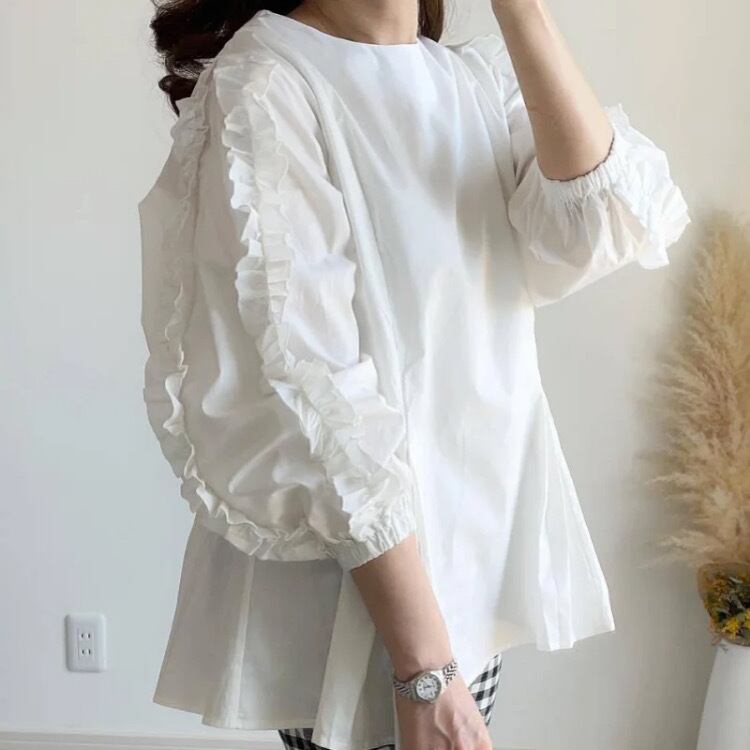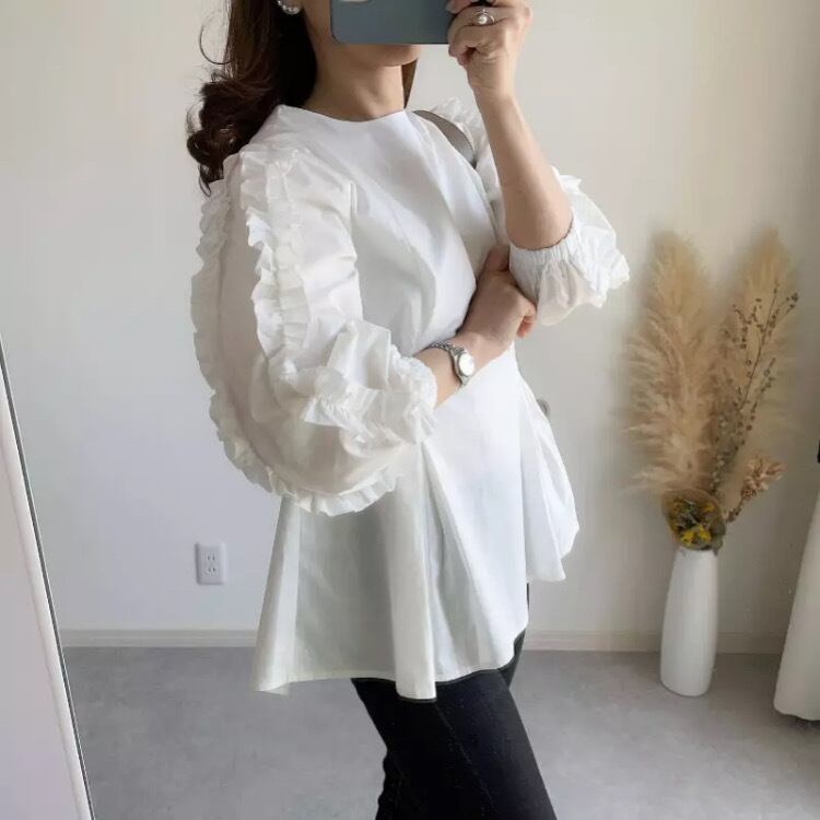 プルオーバー型のブラウスで袖のフリルが華やか。