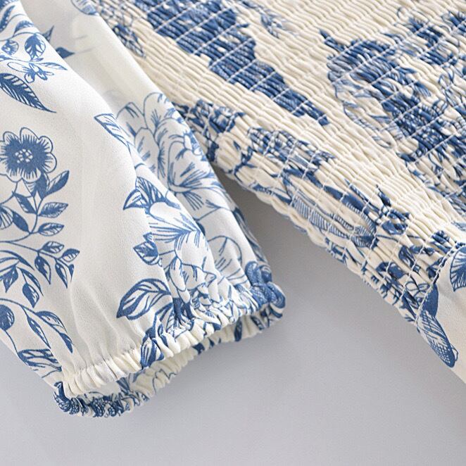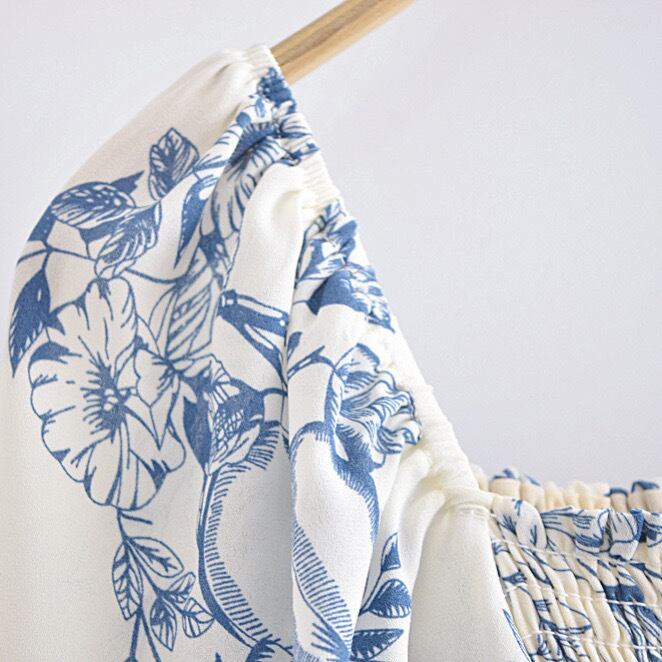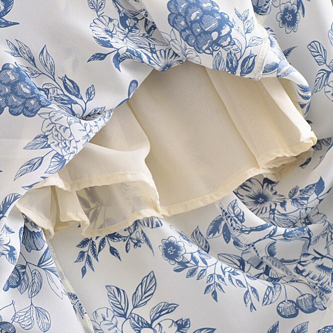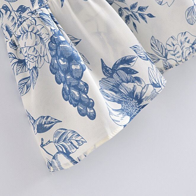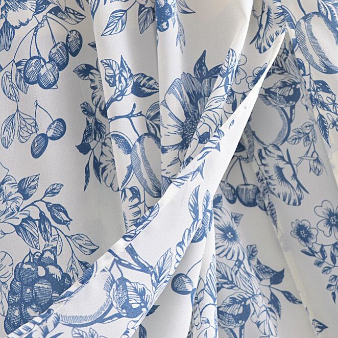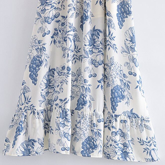 プランツとぶどう、チェリーの美しい青いプリントドレスです。