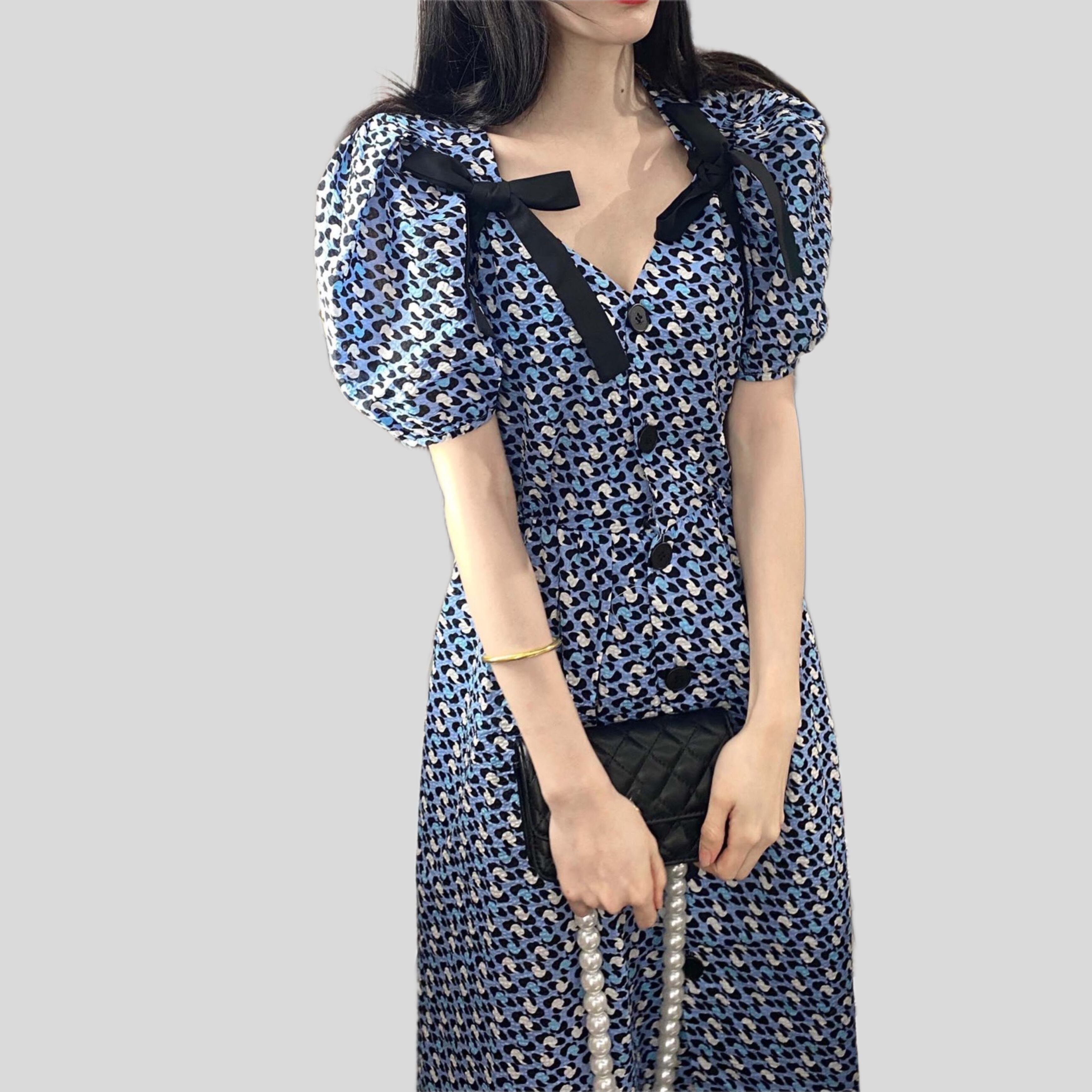 涼しげな凹凸のある生地でできた、ジオメトリックなフラワープリントが映えるワンピース。ネックラインと背中のウエストラインのフェミニンなリボンがアクセント。