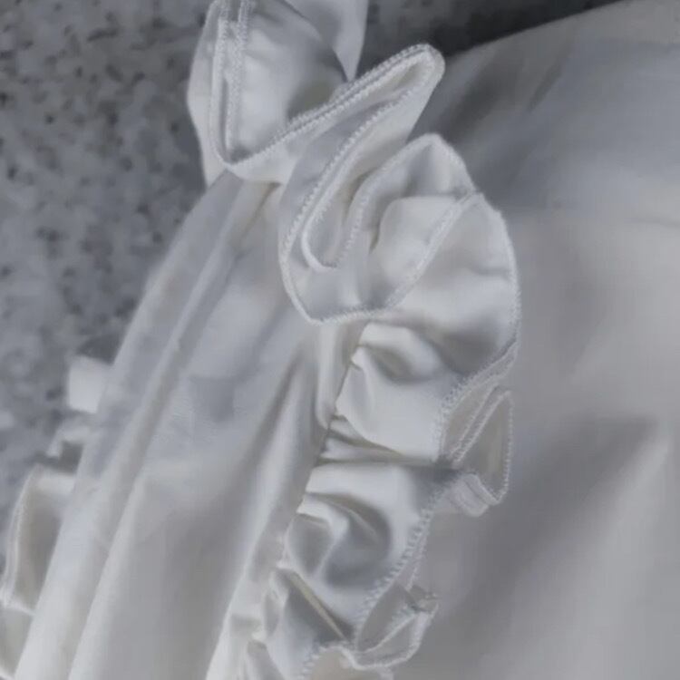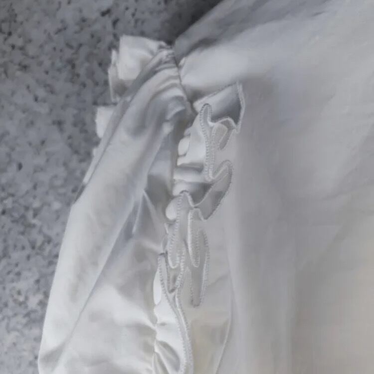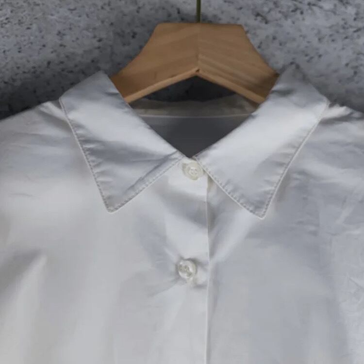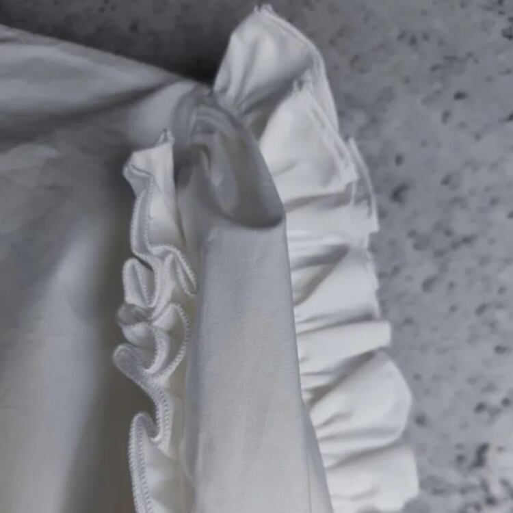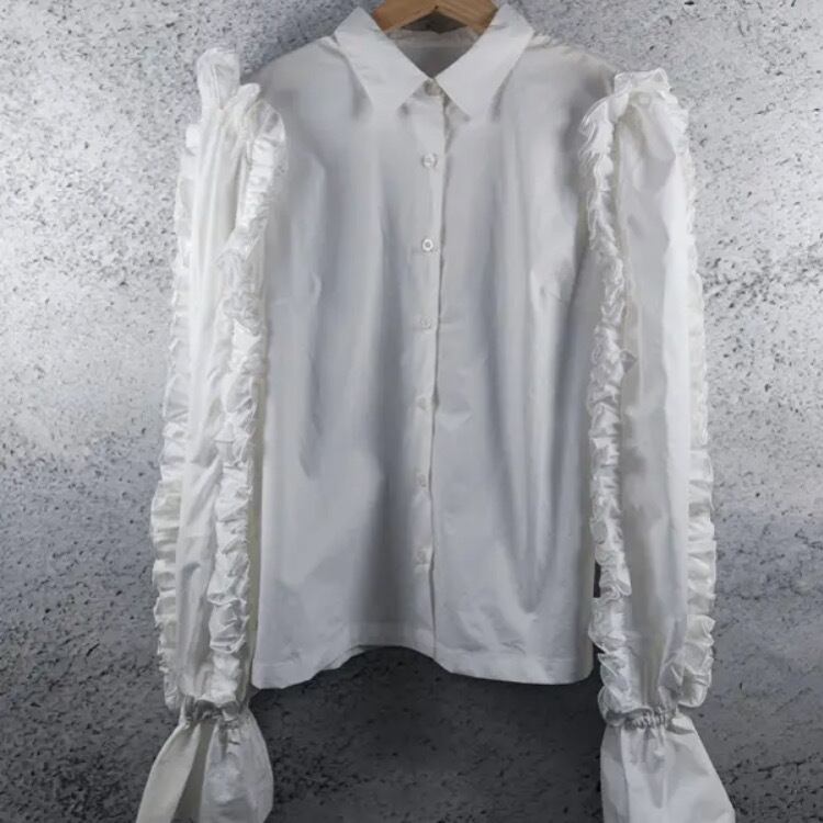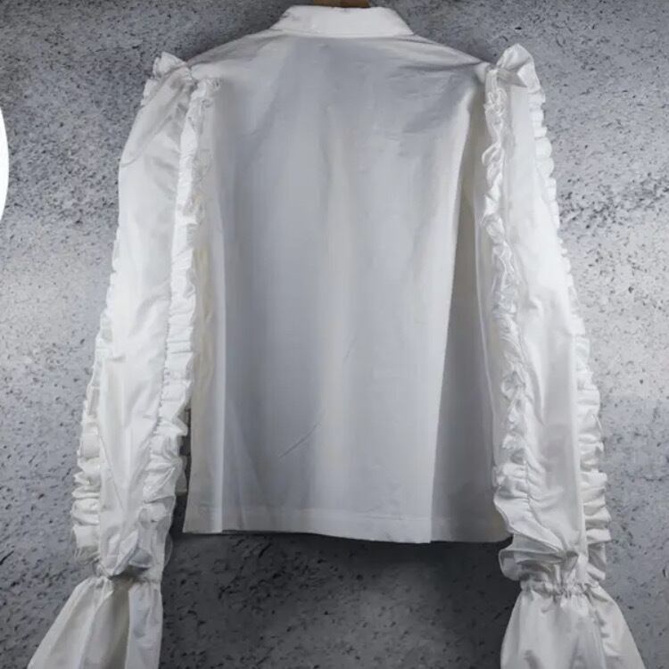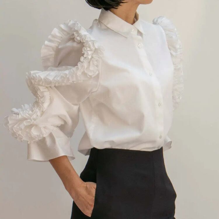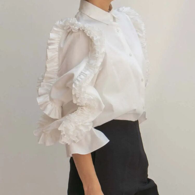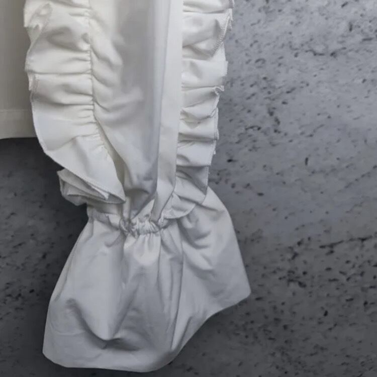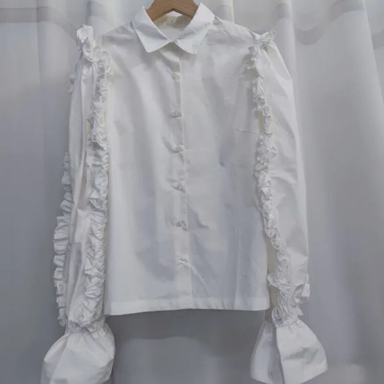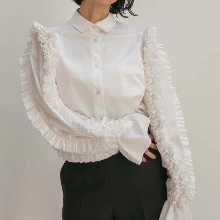 シンプルシャツの前立てならぬ袖にボリュームのあるフリルがついています。