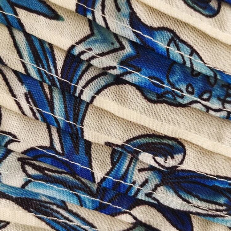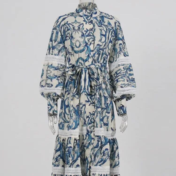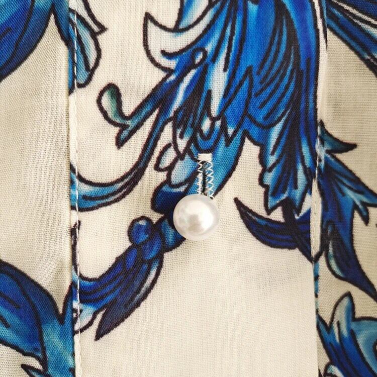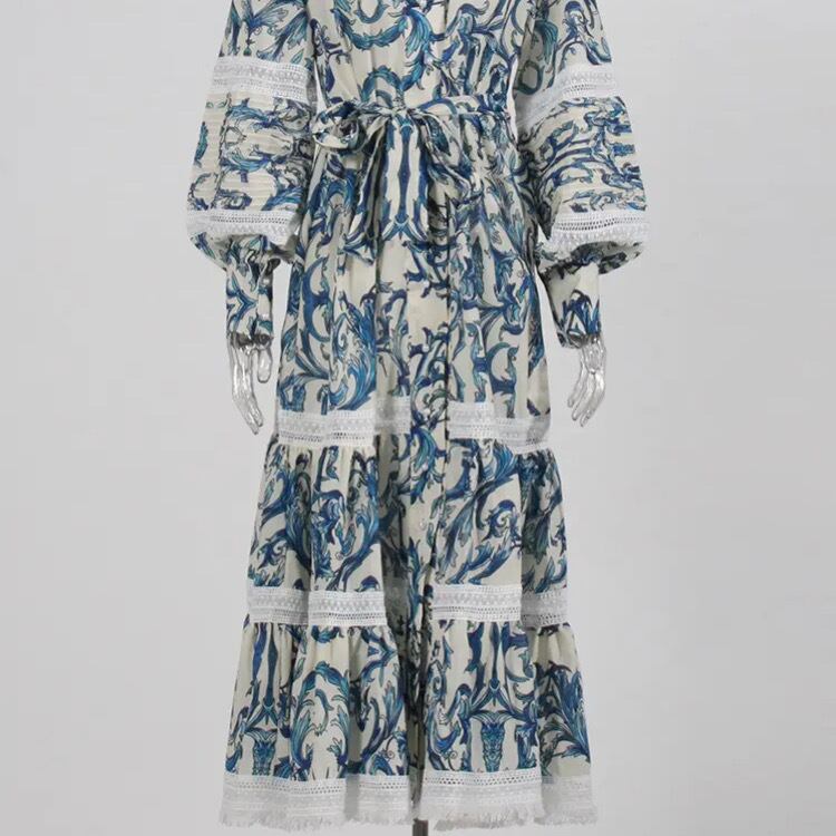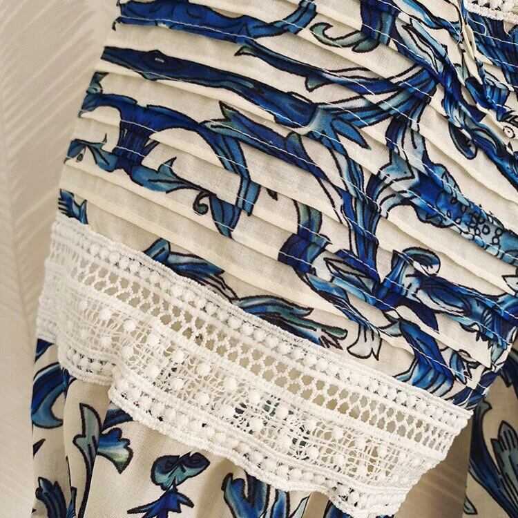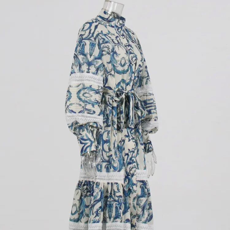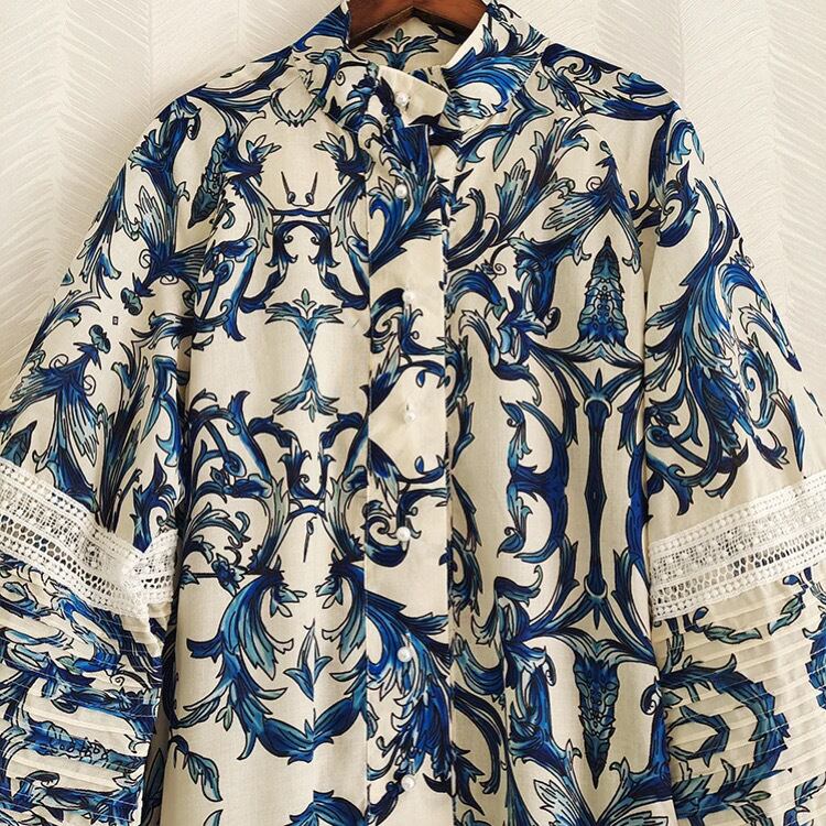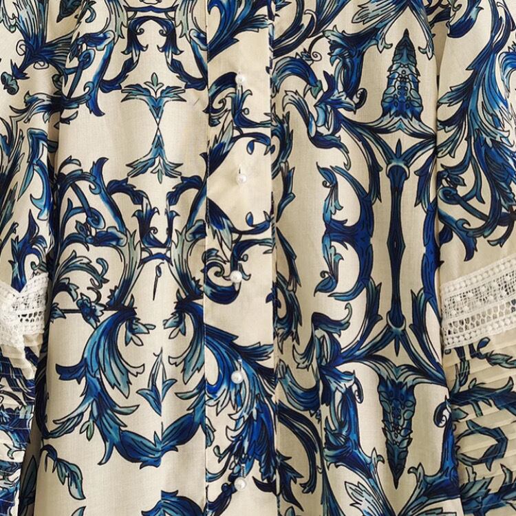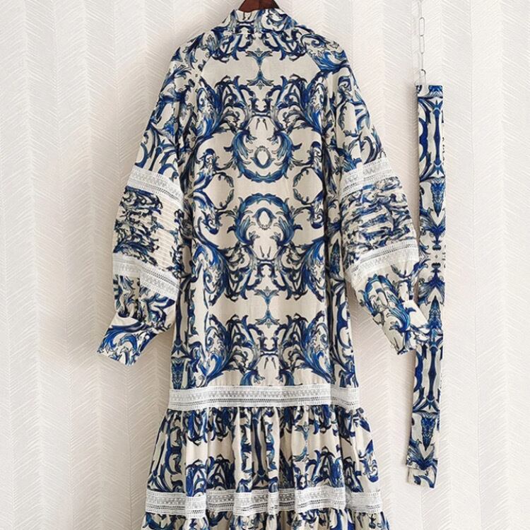 ワンピースの生地には、マジョリカ陶器風のプリントが施され、繊細なレース部分は職人が1枚1枚手作業で編み上げました。