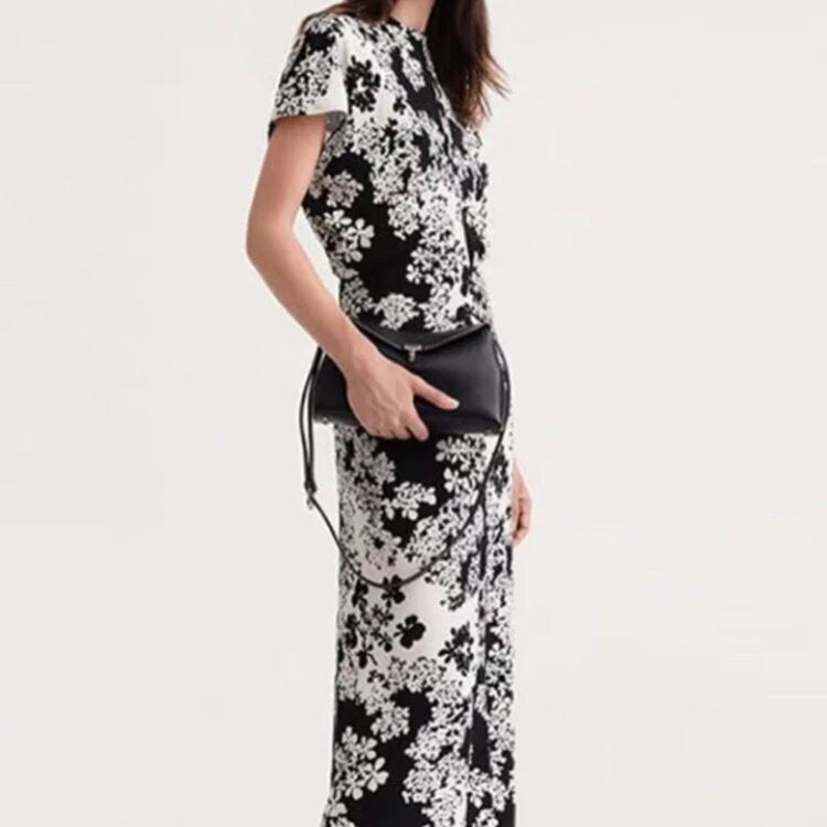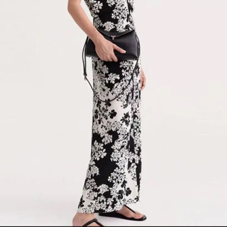流れるような繊細なプリントと、シルエットを引き立てる細身のラインが、とても美しい一着です。