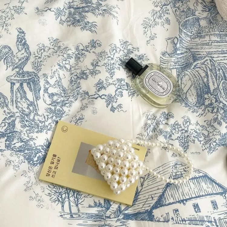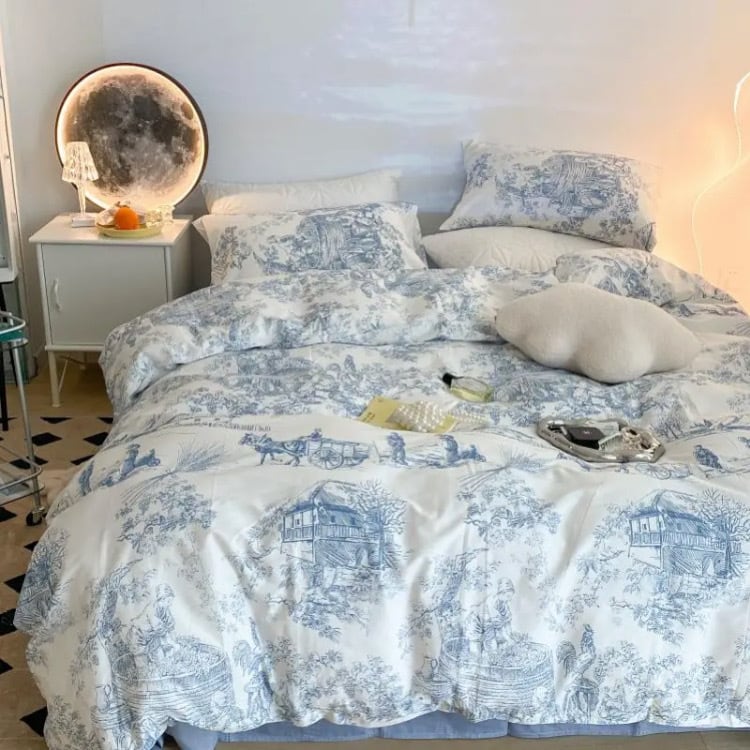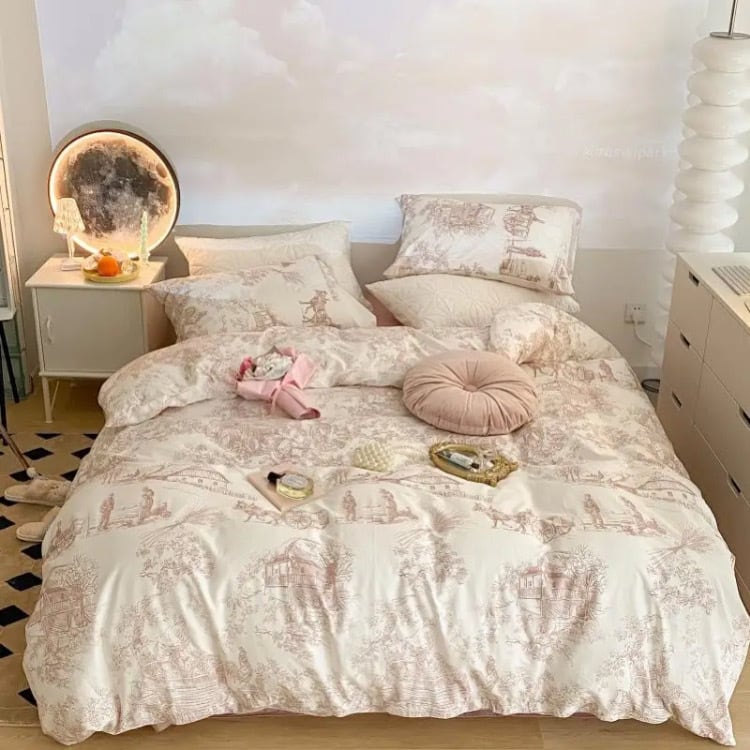 フランスのトワルドジュイ風プリントが印象的な、ヴィンテージ風コットンベッドリネンセット。