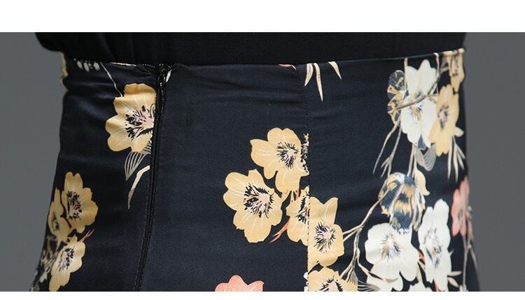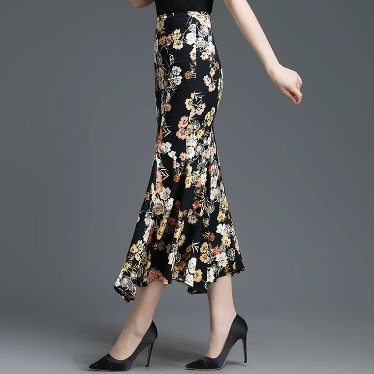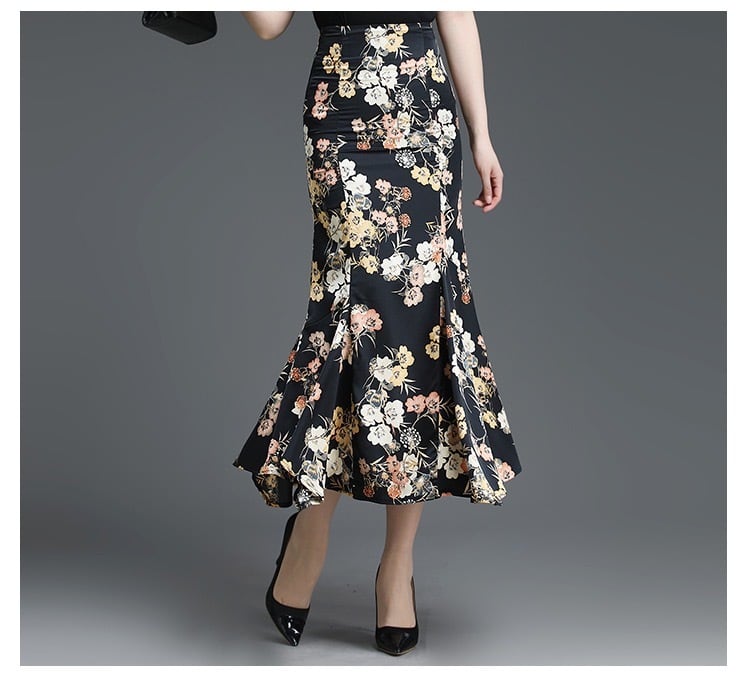 膝下タイトだと没個性になりがちなウェーブさんも、こちらのようなプリント生地のマーメイドなら、裾に動きが出てガラッと華やかに見せます。